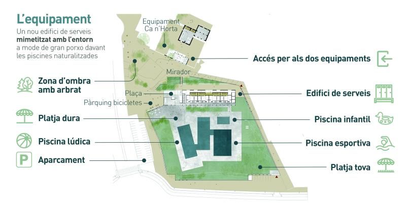 La solució guanyadora per a la zona d’aigua es resol amb una única esplanada i tres piscines diferenciades. Hi haurà una piscina de xipolleig de 20 cm de fondària destinada als infants més petits i pròxima a la zona de vestuaris per un millor accés i control. A la part central s’ubica la gran piscina lúdica en forma d’H que permet un ús menys massificat i agradable. A l’extrem est s’hi troba la piscina habilitada per a la pràctica esportiva. Totes elles són accessibles amb rampes adaptades.