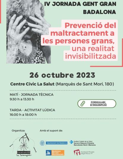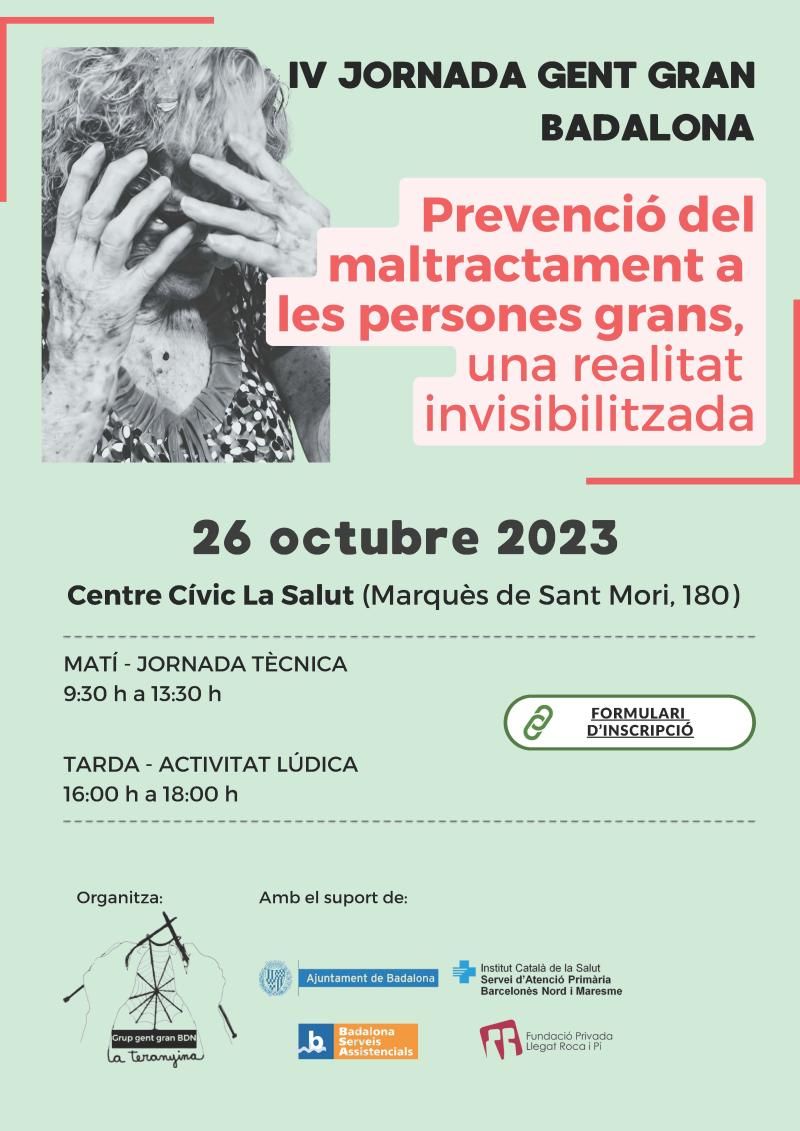 “Prevenció del maltractament a les persones grans, una realitat invisibilitzada” és el títol de la IV Jornada de Gent Gran a Badalona que tindrà lloc dijous 26 d’octubre al Centre Cívic la Salut. La jornada és organitzada pel grup d’entitats socials La Teranyina, que treballen en l’àmbit de la gent gran, amb el suport de l’Ajuntament de Badalona, Badalona Serveis Assistencials (BSA), l’Institut Català de la Salut i la Fundació Llegat Roca i Pi.