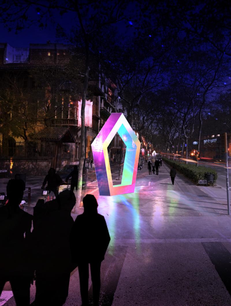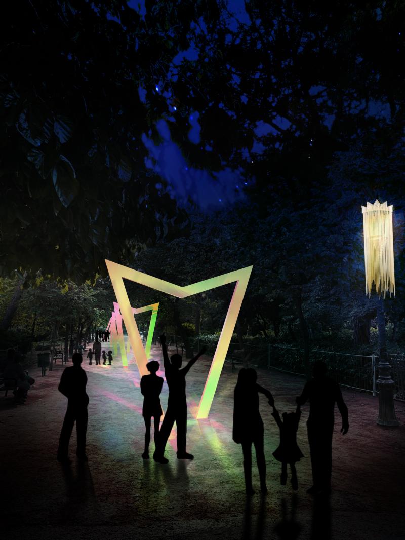 Els elements lumínics són formes geomètriques, des d’1 m d’ample fins a 2,6 metres d’alçada, col·locats a una distància de 8 metres entre si, i la gent podrà passar per dins. La construcció, de la mà de l’estudi de disseny d’il·luminació Artec Studio, serà en estructura d’acer i metacrilat translúcid, recobert per filtre dicròic per generar efectes de color tant de nit com de dia amb el reflex de la llum del sol. Tires de llum led blanc càlid generaran efectes de llum amb moviment vinculant totes les geometries amb el dinamisme de la llum i color. La instal·lació estarà programada, depenent l’horari, amb diferents efectes lumínics i de moviment. La decoració es complementarà amb la col·locació de cortines de cadenetes daurades, que “coronaran” els clàssics fanals de peu de l’entorn.