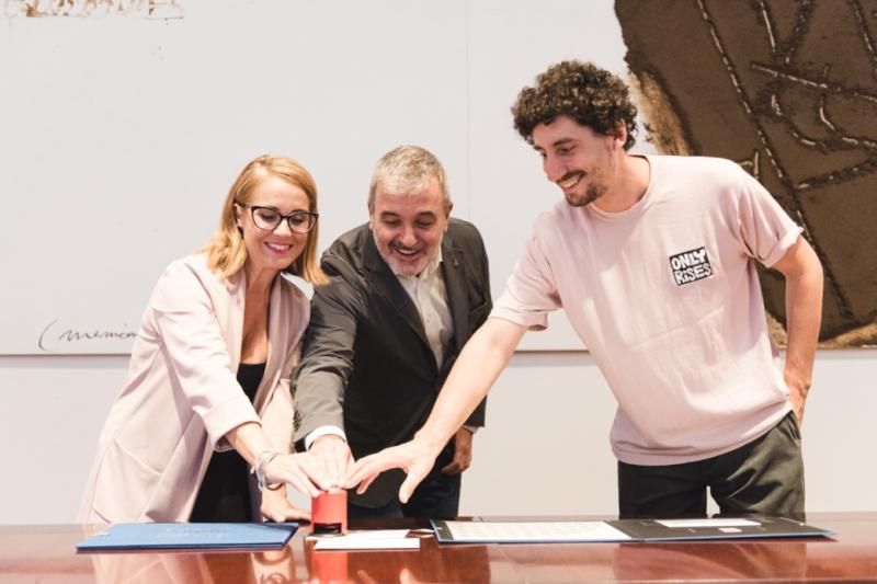 L’alcalde de Barcelona, Jaume Collboni, i la directora de Relacions Institucionals de Correus, Nuria Lera, juntament amb l’artista Chamo San, han fet el matassegellat d’honor.