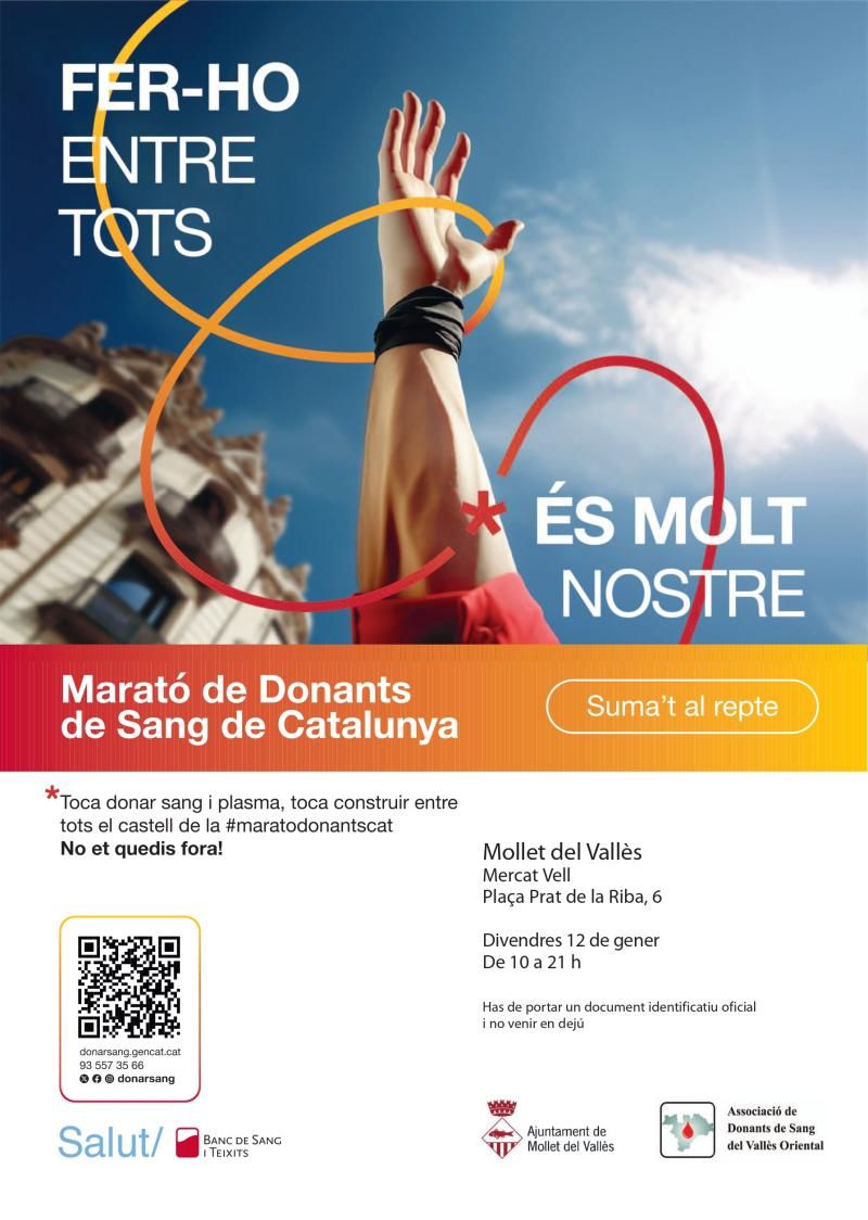 Mollet del Vallès participarà de la Marató de Donants de Sang que es durà a terme de l’11 al 19 de gener arreu de Catalunya. Uns dies durant els quals s’espera aconseguir remuntar les donacions i restablir les reserves de sang que s’han vist afectades per les festivitats de Nadal. A Mollet, el divendres 12 de gener, de 10 a 21 h, el Mercat Vell acollirà aquesta campanya especial de donació de sang i plasma on es preveu arribar a les 200 donacions.