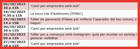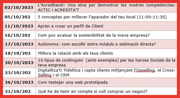 Els tallers presencials d’octubre estan enfocats als comerços. Al novembre, a dissenyar, testejar i innovar en els productes i serveis que ofereixen els negocis i el desembre, s’organitzarà una jornada de casos d’èxit i un taller col·laboratiu per afrontar col·lectivament els reptes dels negocis el 2024.