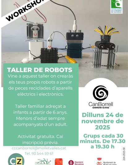 Així, el 24 de novembre, al CC Can Borrell, es durà a terme un Taller de fer robots amb peces d'aparells elèctrics i electrònics. En aquest cas cal preinscripció prèvia a ccanborrell@molletvalles.cat o al telèfon 935 445 961. Les places són limitades.