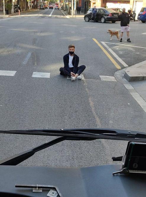 Aquest diumenge s'ha produït una situació surrealista en el barri de la Sagrada Família de Barcelona: un noi ha perdut l'autobús i s'ha assegut enmig de la calçada per a tallar-li el pas, un altre jove li ha fet una foto i el moment s'ha tornat viral en xarxes socials.