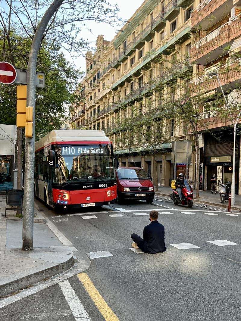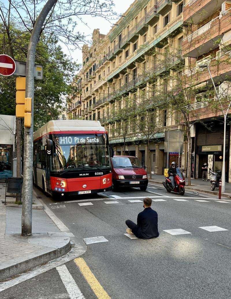 Aquest diumenge s'ha produït una situació surrealista en el barri de la Sagrada Família de Barcelona: un noi ha perdut l'autobús i s'ha assegut enmig de la calçada per a tallar-li el pas, un altre jove li ha fet una foto i el moment s'ha tornat viral en xarxes socials.