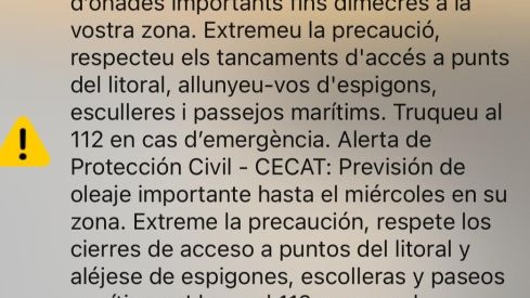 Protecció Civil ha enviat aquest dilluns un missatge als telèfons mòbils dels municipis costaners del Montsià, Baix Ebre, Baix Llobregat, Barcelonès, Maresme i Selva per avisar del risc d’afectacions importants a causa de la llevantada. La mesura, que ja es va aplicar ahir a les comarques del Baix i l’Alt Empordà, busca alertar la població davant els perills que comporta el temporal marítim.