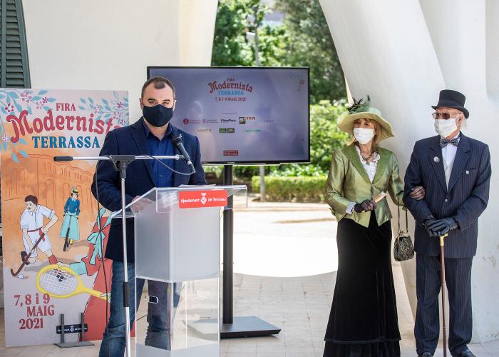 L'alcalde de Terrassa, Jordi Ballart; juntament amb el regidor de Turisme, Pep Forn; la regidora de Comerç, Jennifer Ramírez; i la directora-gerent del Centre de Documentació i Museu Tèxtil de Terrassa (CDMT), Sílvia Comellas, en representació de la Comissió Fira Modernista; han presentat aquest migdia el programa de la Fira Modernista 2021. A l'acte, també han assistit la tinenta d'alcalde de Promoció Econòmica i Projecció de la Ciutat, Núria Marín; la regidora de Cultura, Rosa Boladeras; i el regidor d'Esports, Miguel Ángel Moreno.