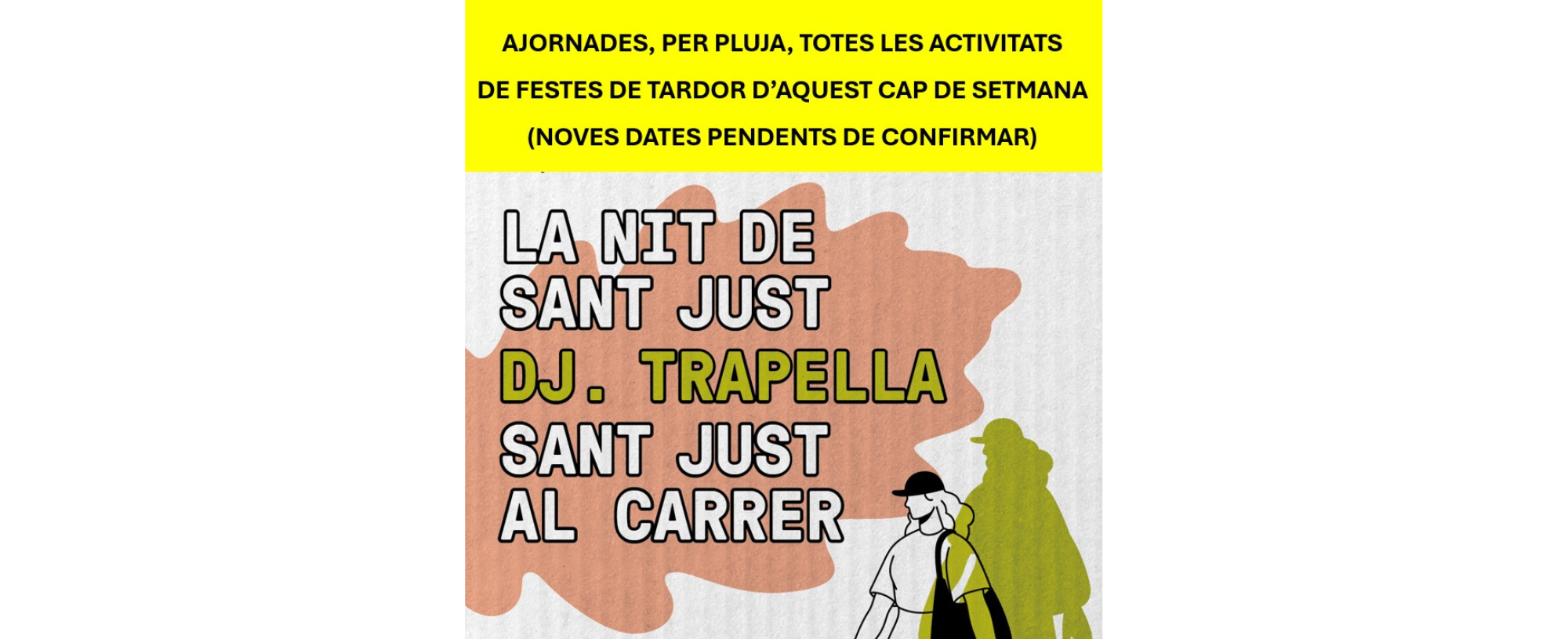 L’Ajuntament de Sant Just Desvern ha decidit ajornar totes les activitats previstes aquest cap de setmana de la Nit de Sant Just Al Carrer de dissabte i de Sant Just Al Carrer de diumenge per l’adversa previsió meteorològica anunciada per a les hores vinents.
