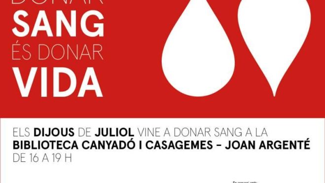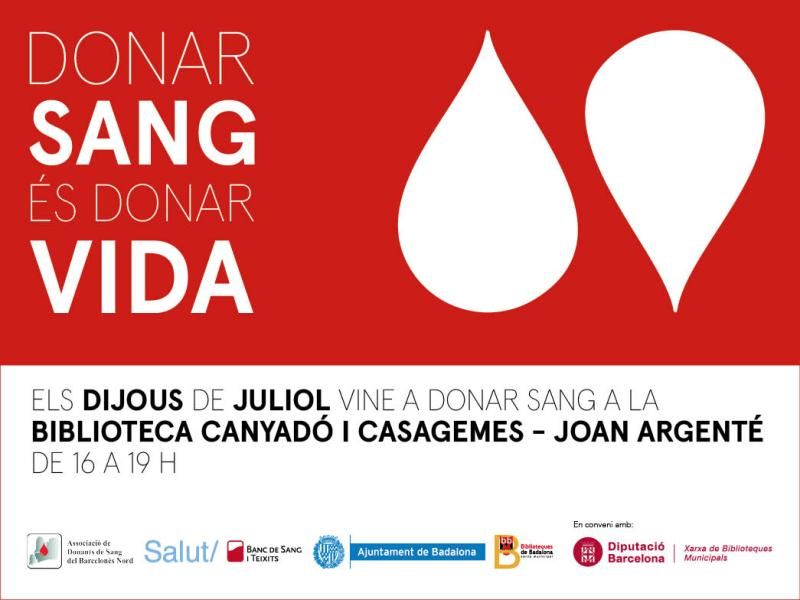 Per evitar aquesta situació i donar suport al Banc de Sang i Teixits, el servei de Salut de l’Ajuntament de Badalona, en col·laboració amb les Biblioteques de Badalona i l'Associació de Donants de Sang del Barcelonès Nord impulsa la campanya “Els dijous de juliol vine a donar sang a Badalona”, una iniciativa que farà que la Biblioteca Canyadó i Casagemes - Joan Argenté es converteixi en un punt fix de donació els dijous  4, 11, 18 i 25 de juliol entre les 16 i les 19 hores.