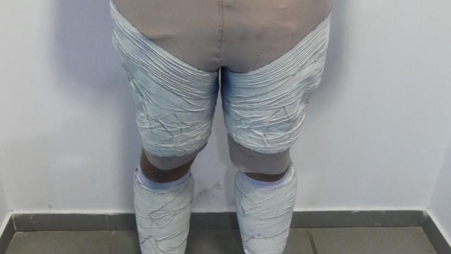 Un cop despullat, la policia va trobar-li vuit planxes embenades amb 2,3 quilos de cocaïna, en un exemple d’una tècnica de tràfic coneguda com a ‘mòmies de la droga’. L’home va ser posat a disposició dels jutjats del Prat de Llobregat per un delicte contra la salut pública.