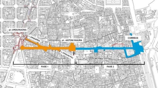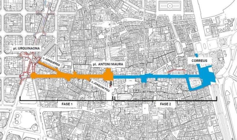 Durant la primera fase, les tasques es duran a terme en el tram comprès entre la plaça d’Urquinaona i la plaça d’Antoni Maura i tindran una durada prevista de 14 mesos. Inclouran la renovació i millora de les xarxes de serveis existents en el subsòl i la reurbanització de la via (entre la plaça d’Urquinaona i la plaça d’Antoni Maura) i del carrer de Jonqueres.