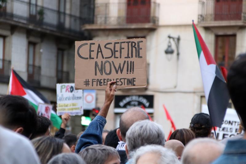 Unes 1.200 persones, segons xifres de la Guàrdia Urbana, s'han aplegat aquest diumenge a la tarda a la plaça Sant Jaume de Barcelona per denunciar el "genocidi" a Gaza i exigir l'alto el foc "immediat". És una de les concentracions propalestines que s'han fet en una cinquantena de municipis catalans, com per exemple Lleida, i que han estat convocades per la Comunitat Palestina de Catalunya i Prou complicitat amb Israel. Entre els clams que s'han pogut sentir a la plaça Sant Jaume hi ha 'Gaza no estàs sola' o 'Israel assassina, Europa patrocina'. A la trobada també s'hi ha llegit un manifest que, llegit entre banderes palestines i cartells reivindicatius, demana aturar el "genocidi" i el comerç d'armes amb Israel.