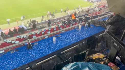 L’aiguat s'ha manifestat especialment intens dins l’estadi, on, malgrat estar en procés d’adequació i reformes, concretament a la tercera graderia, s'ha produït una acumulació d’aigua considerable. Aquesta circumstància ha generat una mena de cascada interna que ha compromès la comoditat dels assistents i els ha obligat a buscar refugi o marxar anticipadament per evitar quedar-se completament mullats.