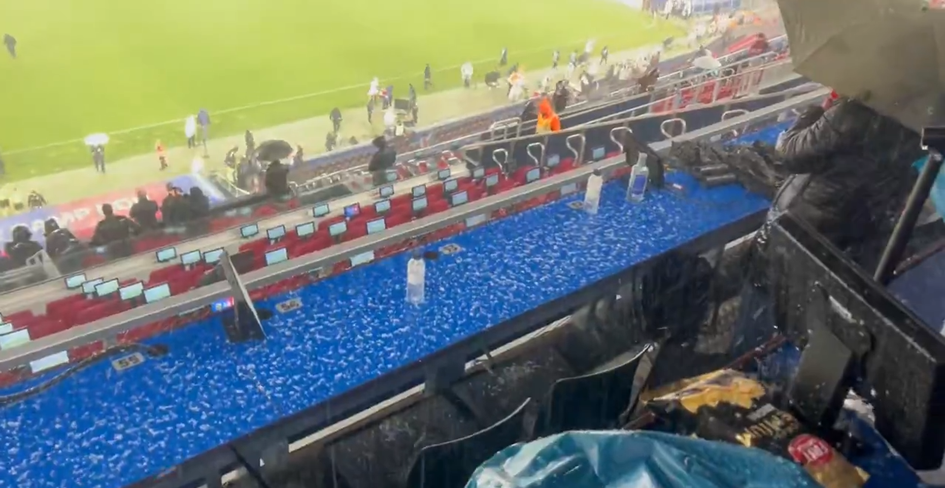 Una intensa pluja i la pedra provoquen la sortida prematura dels espectadors i inunden la zona dels comentaristes esportius