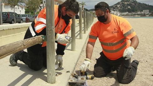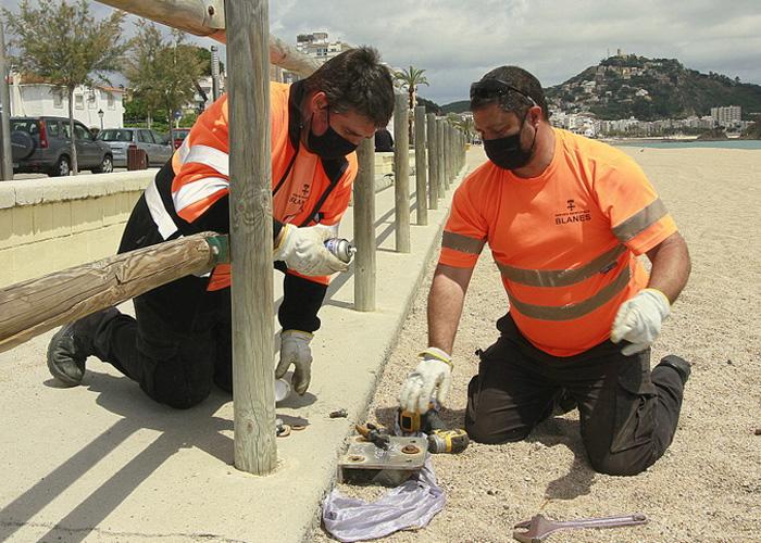 Cada vegada queda menys perquè Blanes visqui -amb el grau de normalitat que ara per ara deixa gaudir la COVID- un esperat inici de temporada estiuenca, que aquest any encara es prepara amb més il·lusió que mai. Després que aquesta setmana s’estan acabant d’enllestir les darreres tasques d’anivellament de la sorra de les platges, ja s’han començat a posar les dutxes que completaran aquest servei iniciat per Setmana Santa amb els seus primers elements.Paral·lelament a la instal·lació d’aquest i d’altres elements –papereres de reciclatge complementades, zones d’ombra, passarel·les d’accés, etc-, hi ha d’altres serveis que també estan situats arran de mar que es volen tenir a punt i millorats quan comenci la temporada estiuenca, que serà de cara al proper mes de juny. Per això, les brigades dels Serveis Municipals ja fa dies que estan treballant en diversos punts.Un d’ells és un dels blocs de serveis que hi ha arran de mar, a la zona del Passeig de S’Abanell, que va quedar molt malmès durant el Temporal Glòria del gener del 2020. El bloc –com la resta dels què també hi ha en aquesta zona del litoral blanenc- inclou un restaurant i una zona de lavabos públics. La infraestructura va patir l’embat de les onades, que van entrar a l’interior del restaurant, arrossegant aigua i sorra a l’interior, provocant nombroses destrosses dins i fora.Posteriorment, amb el pas del temps, diverses bretolades i grafits han acabat de conferir-li un aspecte que ara es vol redreçar dins de les possibilitats, ja que es tracta d’un espai privat de concessió estatal. En la mesura del possible, doncs, els Serveis Municipals estan procedint a desmuntar i reparar algunes parts i donar-li una millor imatge.Altres actuacions arran de marUn altre focus d’atenció en què estan treballant els operaris dels Serveis Municipals és la millora, substitució i reparació dels bancs de fusta que hi ha a la part del Passeig de Mar que coincideix amb el nucli històric de Blanes. És el tram del Passeig de Mar més transitat pels vianants, sense cap mena de dubte, i coincideix també amb alguns dels grans esdeveniments que s’organitzen al llarg de l’any.Inclou diversos trams de bancades, abastant el Passeig Cortils i Vieta i el Passeig Pau Casals fins a la zona on hi ha el Banc dels Músics. A partir d’aquí, els bancs per poder seure passen a ser de pedra. Al tram central, en total, hi ha 20 bancs de fusta de grans dimensions que es van instal·lar fa prop de 30 anys, al 1993, quan es va estrenar la remodelació del Passeig de Mar, tant pel que fa al tram sobre el pàrquing soterrat com l’altra part que discorre aproximadament des de l’alçada del Carrer Ample. Des de llavors, l’Ajuntament de Blanes els ha remodelat en diverses ocasions.Aquest estiu s’està procedint a tractar cadascuna de les 20 bancades de la millor manera possible, en funció del seu estat. En alguns casos s’ha substituït les fustes que composen el banc per llistons nous, i en d’altres s’han reparat els danys. En tot cas, el què també s’ha fet és pintar i envernissar per millorar el seu aspecte.Per últim, altres actuacions que també estan fent els Serveis Municipals és instal·lar els elements fixos que formaran part del paisatge estiuenc aquest estiu. Són els màstils que subjectaran les banderes que indicaran l’estat de la mar al llarg de diversos punts del passeig, a tocar de la platja, així com els pals des d’on onejaran les Banderes Blaves de Qualitat Mediambiental, que es penjaran les properes setmanes com indicatiu de l’excel·lent estat en què es troben l’aigua i la sorra de les tres principals zones de bany: Cala Bona, Blanes Centre i S’Abanell.