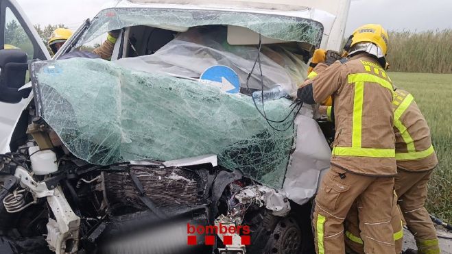 L’avís s’ha rebut a les 17.58 hores i fins al lloc s’hi han desplaçat sis dotacions dels Bombers de la Generalitat, que han hagut de treballar per excarcerar el conductor de la furgoneta, que havia quedat atrapat entre la ferralla del vehicle.