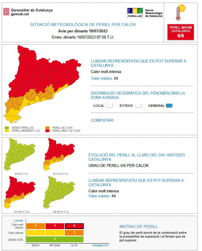 Catalunya està vivint aquest dimarts, 18 de juliol, el seu dia més calorós de la història, com a mínim tenint en compte les dades de la Xarxa d'Estacions Meteorològiques Automàtiques (XEMA) de més de 30 anys de dades del Meteocat. Fins avui, mai s'havia superat de forma oficial a tot el territori la temperatura de 43,8 °C, marcada per l'estació d'Alcarràs, al Segrià, el 29 de juny del 2019.
