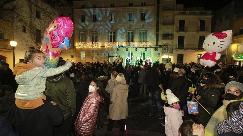 Aquí baixaran de les respectives carrosses els tres reis i el seguici que els acompanyarà per fer el darrer tram del recorregut a peu pel Passeig de Dintre, fins a arribar davant del pessebre, on faran la tradicional salutació al Nen Jesús, com fan les figuretes dels pessebres que els representen. Tot seguit, pujaran al Despatx d’Alcaldia, des d’on saludaran la mainada que s’hagi congregat a la plaça dels Dies Feiners, i els obsequiaran amb una pluja de caramels. Una tradició que es recuperarà aquest 2023 després de dos anys que no se’n podien repartir.