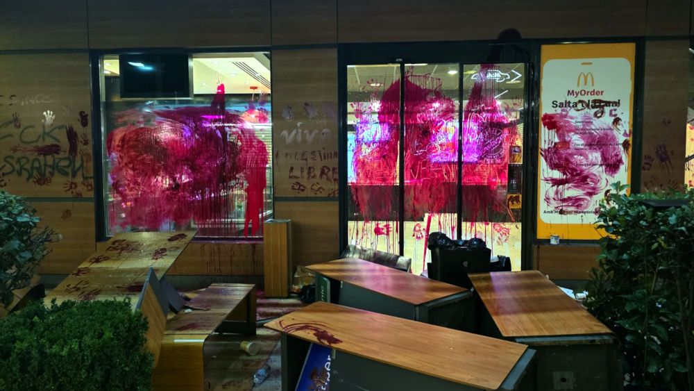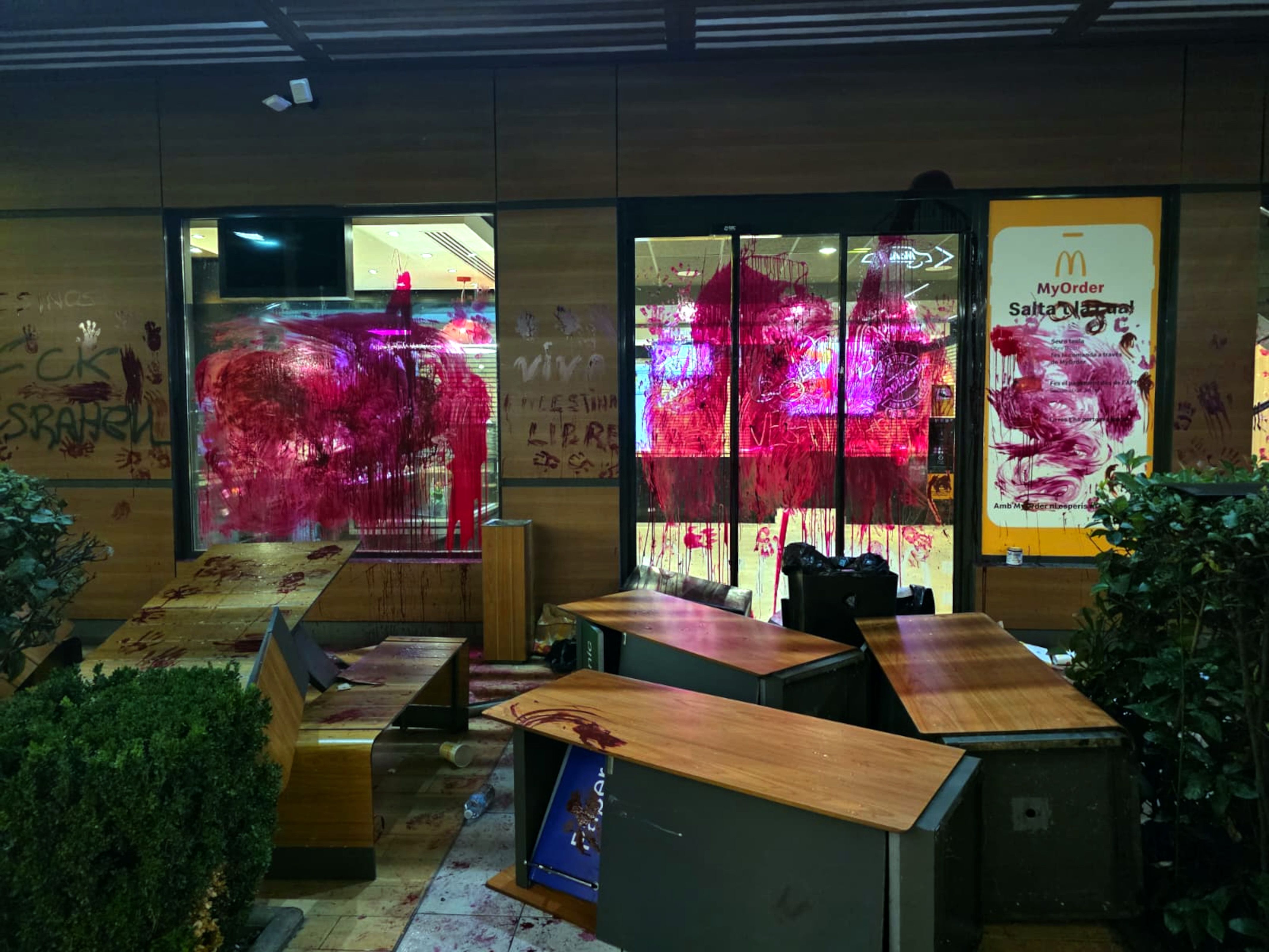 La mobilització va reunir més de 1.500 persones i va arrencar a la plaça del Vi, on es va llegir un manifest i es van transmetre missatges enviats pels tres activistes gironins detinguts a Israel. Posteriorment, els participants van recórrer els carrers fins a arribar a l’avinguda Josep Tarradellas, davant d’un establiment de menjar ràpid. Allà, alguns manifestants van llançar pintura vermella contra vidres i parets i van malmetre el mobiliari de la terrassa.