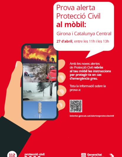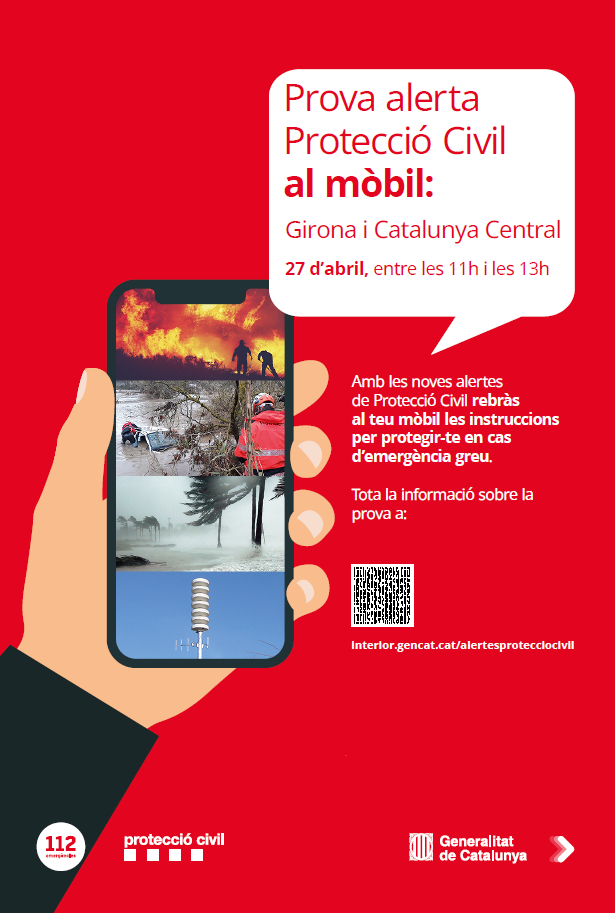 El dia 27 d’abril a partir de les 11.00 hores es durà a terme als territoris de la Catalunya Central i Girona la tercera de les 4 proves que es realitzaran a tot el territori català per donar a conèixer entre la ciutadania el sistema d’alertes de protecció civil a la població. El missatge que es rep no es tracta d’un SMS, és un missatge emergent de text acompanyat d’un so molt estrident que no finalitza fins que l’usuari prem una tecla.