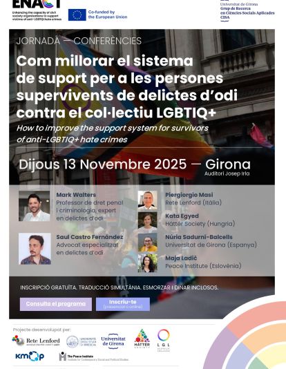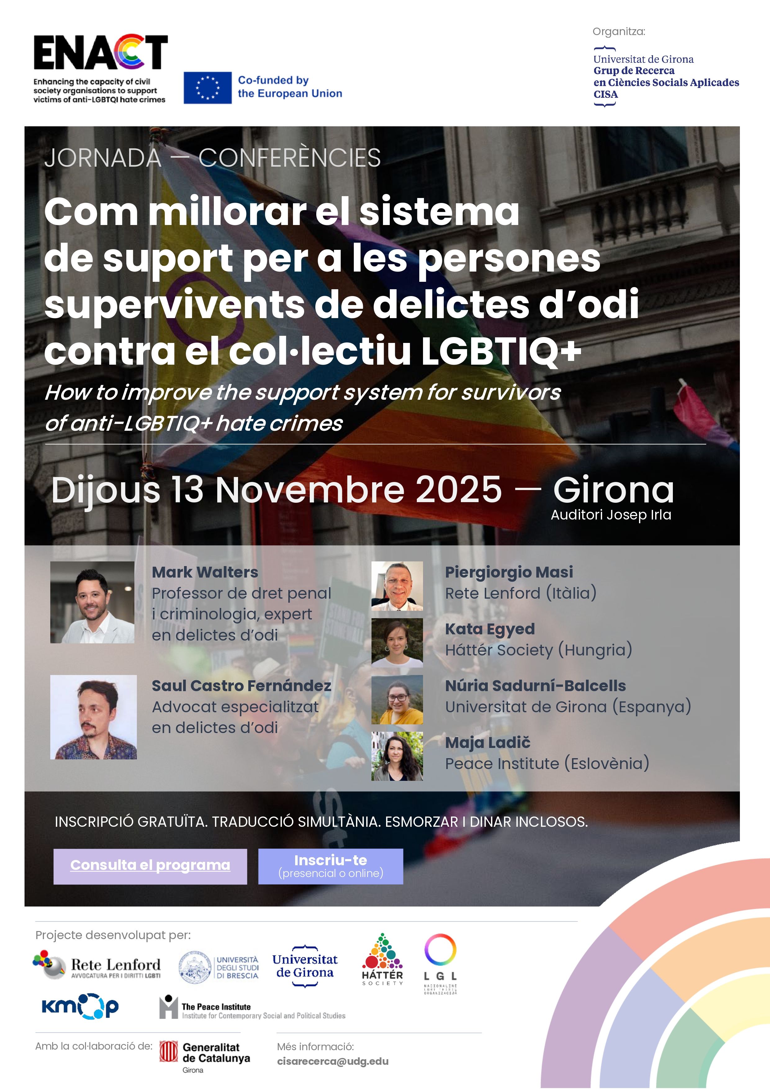 El dijous 13 de novembre, l’Auditori Josep Irla de Girona acollirà la jornada internacional “Com millorar el sistema de suport per a les persones supervivents de delictes d’odi contra el col·lectiu LGBTIQ+” (How to improve the support system for survivors of anti-LGBTIQ+ hate crimes) organitzada pel Grup de Recerca en Ciències Socials Aplicades (CISA) de la Universitat de Girona (UdG).