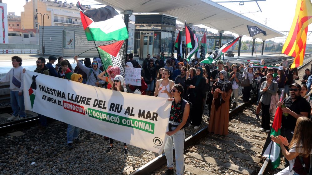 Més de 400 persones es manifesten a Girona i tallen la circulació de trens: "Per Palestina, tots a la via!"