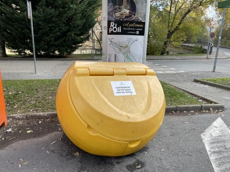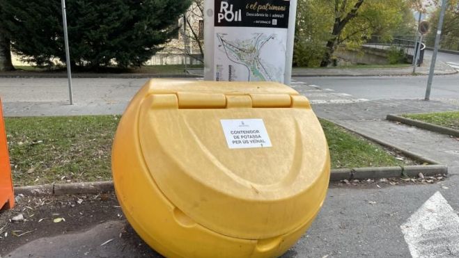 L’Ajuntament de Ripoll ha tornat a instal·lar contenidors de potassa a diferents punts de la vila coincidint amb l’inici de les glaçades a les nits, per tal que la ciutadania en pugui fer ús. Tot i que la brigada municipal s’encarrega de la distribució de la sal a la via pública del municipi, diferents particulars sol·liciten poder-la utilitzar per a ús domèstic, és a dir, per col·locar al carrer just davant de casa seva o bé per escampar-la en espais molt concrets on es detecti perill de patinar.