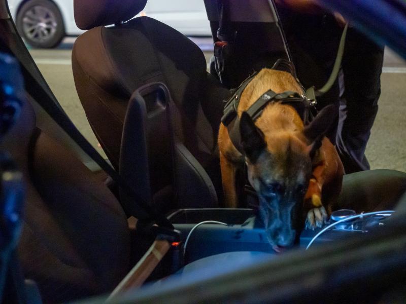 La patrulla es va dirigir al vehicle acompanyada del seu titular i s’efectuà un escorcoll del cotxe. El gos va marcar dos positius i es localitzaren a l’interior de la guantera 8 dosis de marihuana, 8 dosis d’haixix i 22 dosis de cocaïna. Així mateix, es van trobar al vehicle dues caixes de gas nitrós i altres objectes com una barra de ferro de 60 cm amb mànec de fusta que podria ser utilitzada com a arma.