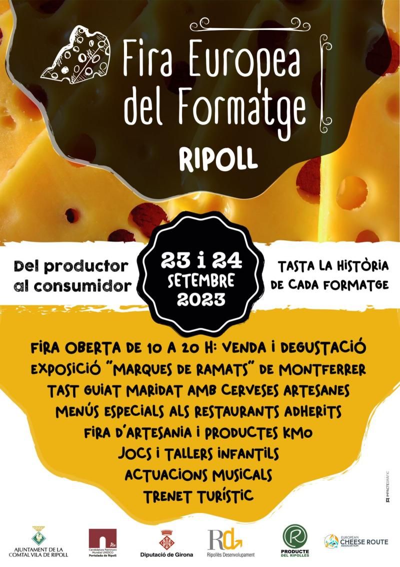 Els dies 23 i 24 de setembre, el centre Ripoll acollirà una nova edició de la Fira Europea del Formatge. Organitzada per l’Ajuntament de Ripoll en col·laboració amb l’Agència de Desenvolupament del Ripollès i l’Associació Ruta Europea del Queso, la mostra reunirà productors de formatge del Ripollès i Europeus i punts de venda de productes afins, com ara vins i cerveses.