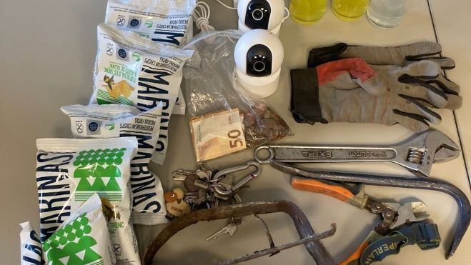 Durant el registre personal, els policies van trobar diverses bosses amb patates, begudes refrescants, un obridor i diners en metàl·lic que presumptament havia sostret del negoci. A més, entre les pertinences de l'individu s’hi trobaven unes eines que podrien haver estat emprades per accedir il·lícitament a l’establiment.