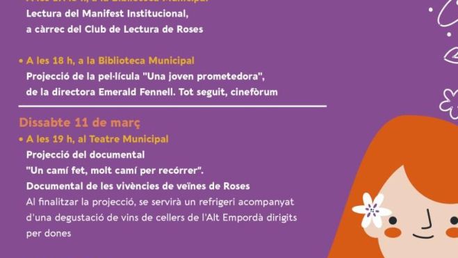 Roses celebrarà enguany el Dia Internacional de les Dones amb un programa d’actes que tindrà lloc els dies 8 i 11 de març i que inclourà la lectura del manifest institucional seguida de la projecció de la pel·lícula ‘Una joven prometedora’ (dimecres 8) i la projecció del documental ‘Un camí fet, molt camí per recórrer’, protagonitzat per dones rosinques, dissabte 11 de març.