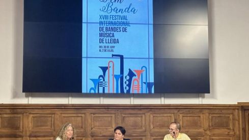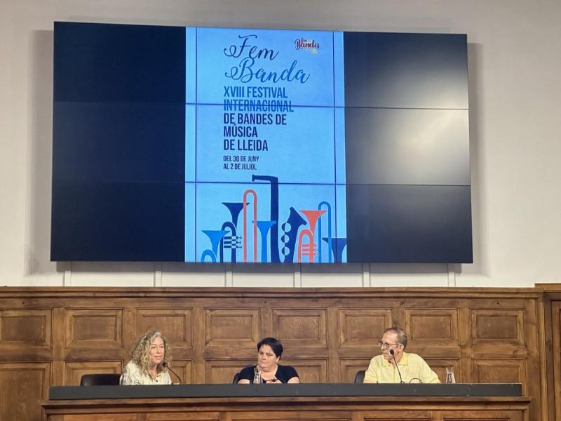 La regidora de Cultura, Pilar Bosch; la vicepresidenta de la Diputació de Lleida, Estefania Rufach, i el director de la Banda Municipal de Lleida, Amadeu Urrea, han presentat el XVIII Festival Internacional de Bandes de Música de Lleida “Fem Banda” que se celebra a Lleida fins diumenge, 2 de juliol i en què prop de mig miler de músics i acompanyants protagonitzaran aquest cap de setmana simfònic.