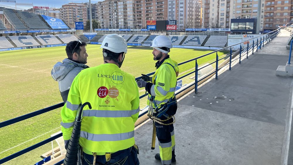 L’empresa concessionària del contracte de manteniment de l’enllumenat de la ciutat ha iniciat aquest dijous les tasques de renovació de la il·luminació del Camp d’Esports, on es substituiran els projectors actuals per nous projectors LED. Aquesta actuació permetrà millorar notablement l’eficiència energètica, amb un estalvi del 61,4% en el consum, així com les prestacions de confort lumínic i reproducció cromàtica.
