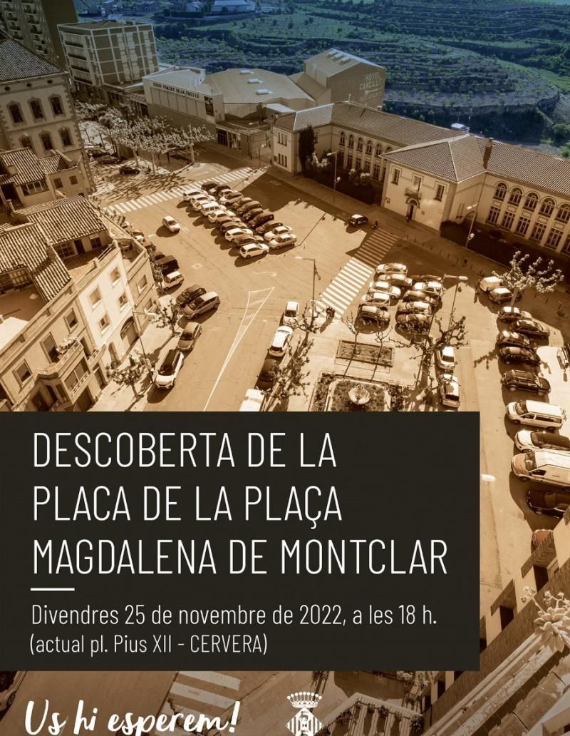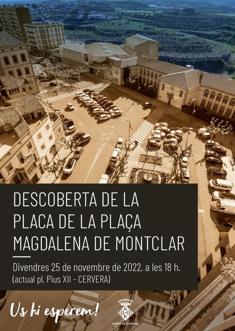 La Paeria de Cervera farà efectiu el canvi de nom de la plaça Pius XII pel de Magdalena de Montclar, divendres 25 de novembre, amb un acte públic de descoberta de placa amb la nova denominació de la plaça.