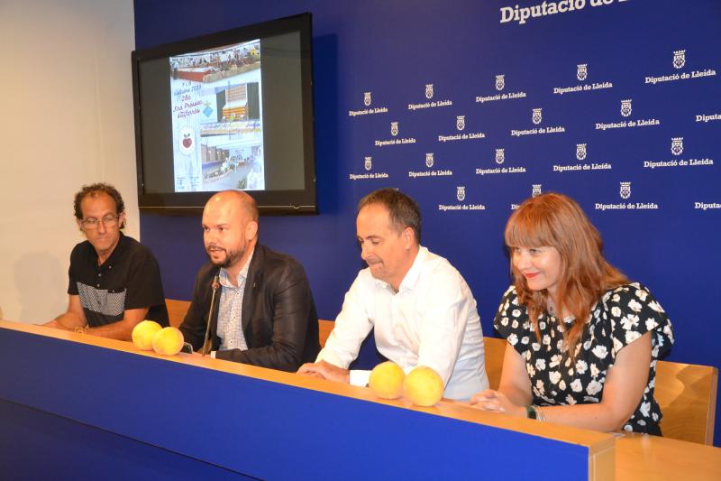 El vicepresident del Patronat de Promoció Econòmica, Jordi Verdú; l’alcalde d’Alfarràs, Joan Carles Garcia; el regidor d’Agricultura, Benet Peró, i la vicepresidenta de l’Associació de Comerciants i Empresaris d’Alfarràs, Esther Mellado, han presentat aquest dimarts la 28a Fira del Préssec d’Alfarràs, que se celebrarà els dies 7 i 8 d’octubre.