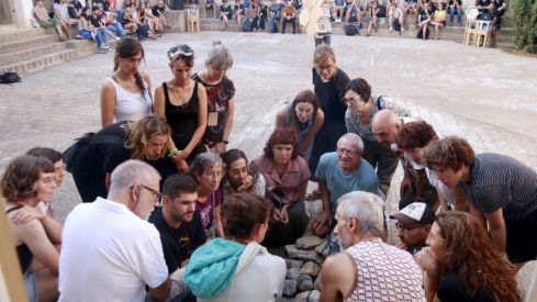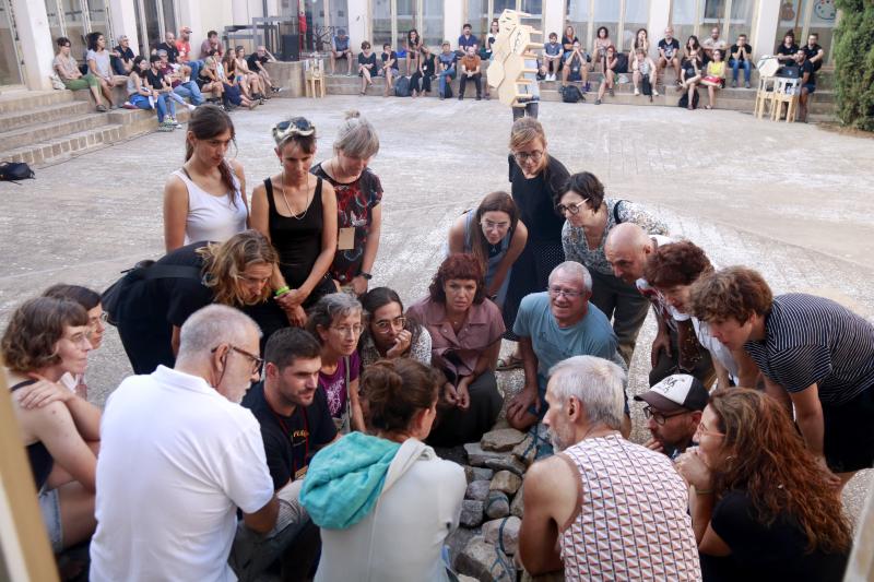 La companyia de circ "eia" ha presentat aquest dijous a FiraTàrrega 'La pedra de fusta', un espectacle on la línia entre els intèrprets i el públic es dissol per compartir una experiència a través dels llenguatges circenses de l'equilibri, la confiança i l'humor.