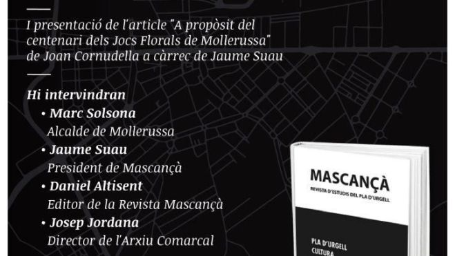 La presentació, que canvia el seu lloc habitual que és la biblioteca i es fa al Teatre L’Amistat amb motiu del seu centenari, anirà a càrrec de l’alcalde de Mollerussa, Marc Solsona; el president de Mascançà, Jaume Suau; l’editor de la revista, Daniel Altisent; i el director de l’Arxiu Comarcal del Pla d’Urgell, Josep Jordana.