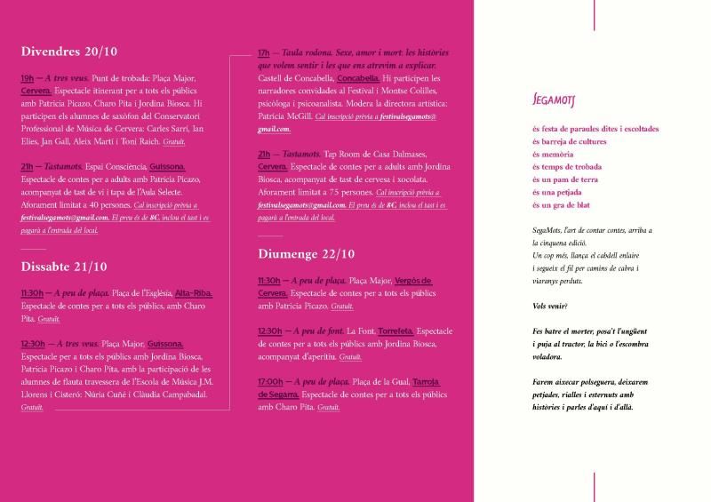 El Festival es durà a terme entre els dies 20 i 22 d’octubre a Cervera, Guissona, Alta-riba, Concabella, Vergós, Torrefeta i Tarroja.