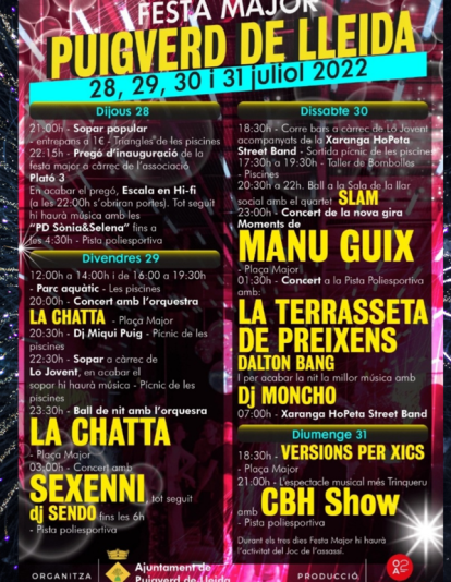 La Festa Major de Puigverd de Lleida 2022 de oferirà activitats per a tots els públics del 28 al 31 de juliol. 4 dies amb activitats per a totes les edats i gustos.