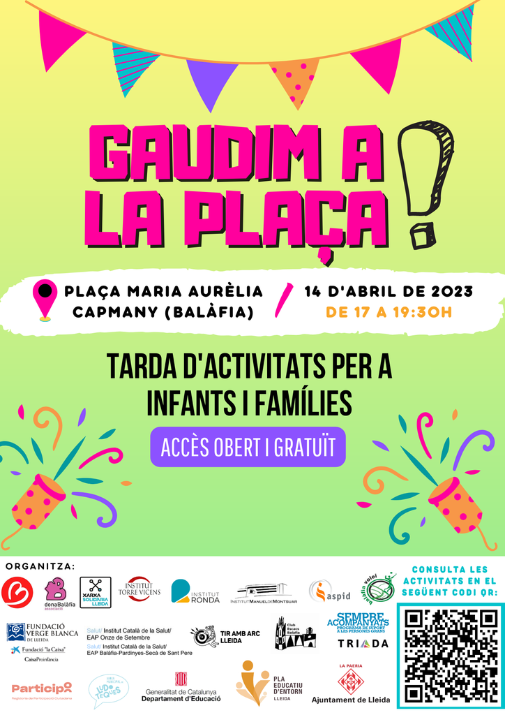 La Comissió d’escola i entorn del barri de Balàfia ha organitzat per aquest divendres, 14 d’abril, la VI edició del “Gaudim a la plaça”, amb activitats per a infants i famílies a la plaça Maria Aurèlia Capmany, al costat del Centre cívic del barri. De les 17 a les 19.30 h, hi haurà accions diverses, preparades per les entitats implicades en el projecte, perquè tothom pugui compartir un espai de joc i socialització.