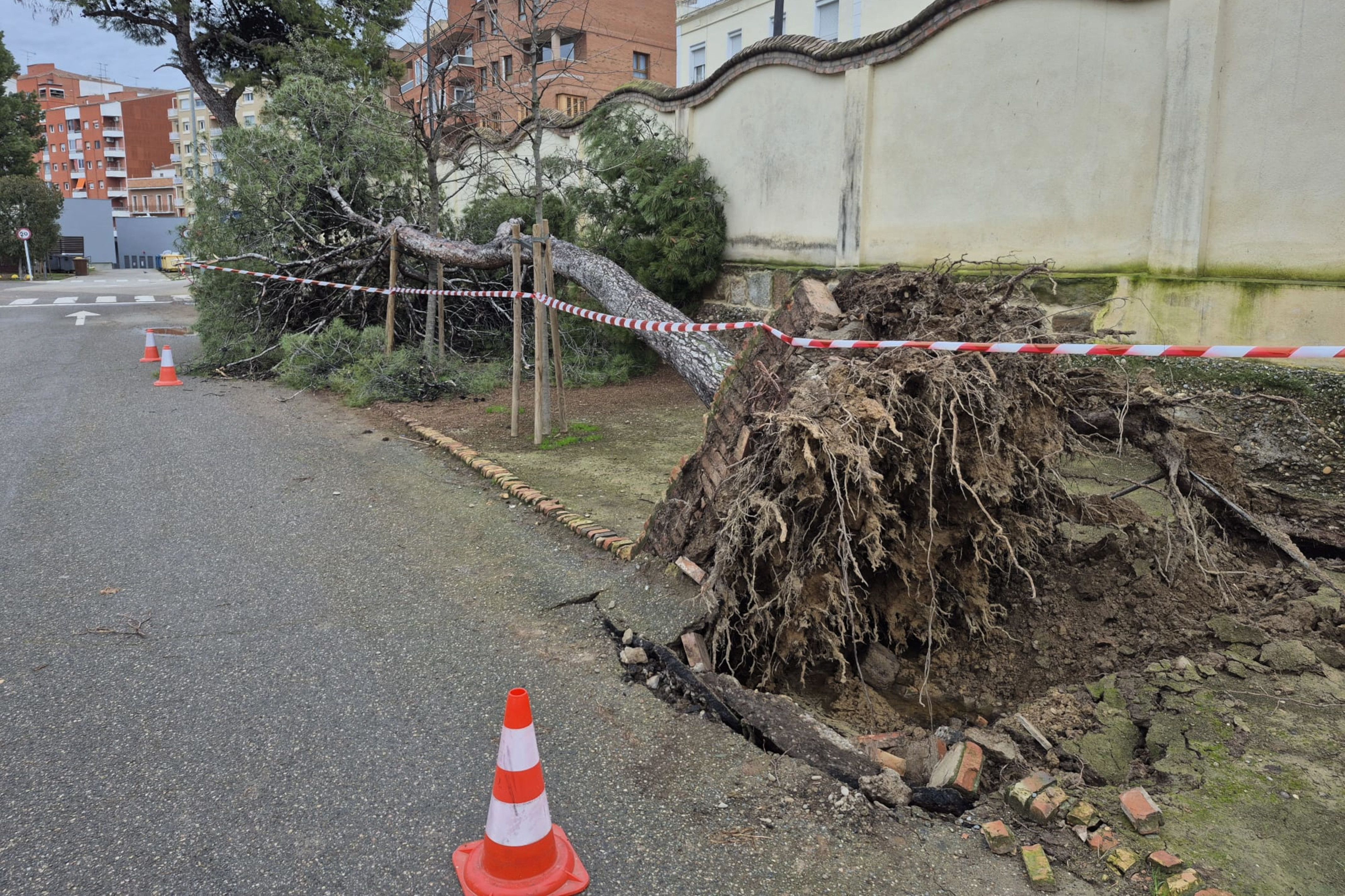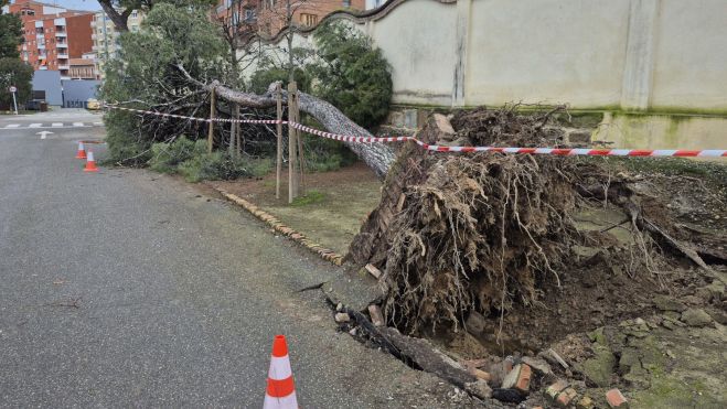 D’altra banda, l’acumulació de pluja i les fortes ratxes de vent del cap de setmana passat van provocar la caiguda d’un dels pins del recinte hospitalari. L’incident no va causar danys personals ni materials a la tanca perimetral, tot i que va arrencar part del paviment i va malmetre arbres adjacents.