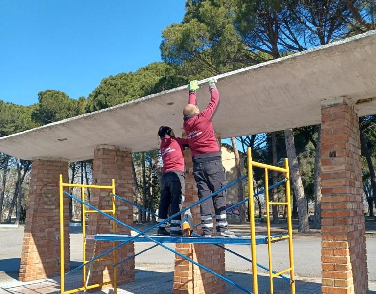 L’actuació consisteix en la pintura de les fites de pedra que delimiten la zona de pas; la pintura de la façana de l’edifici, que ara es trobava ple de pintades; l’enderroc dels dos murs d’entrada i l’arranjament de la reixa i d’un altre petit mur; la neteja i arranjament de la zona de les jardineres; i la neteja dels grafitis de l’estructura d’entrada al parc.