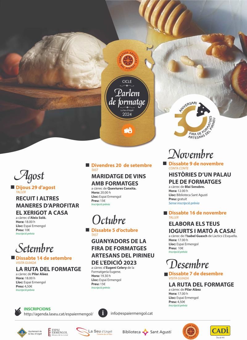 El Parlem de Formatge 2024, s’iniciarà de manera oficial el dijous 29 d’agost, amb el taller “Recuit i altres maneres d’aprofitar el xerigot a casa” que tindrà lloc a l’Espai Ermengol, a càrrec d’Aleix Solé, a les 18 h. El cost serà de 10 €.