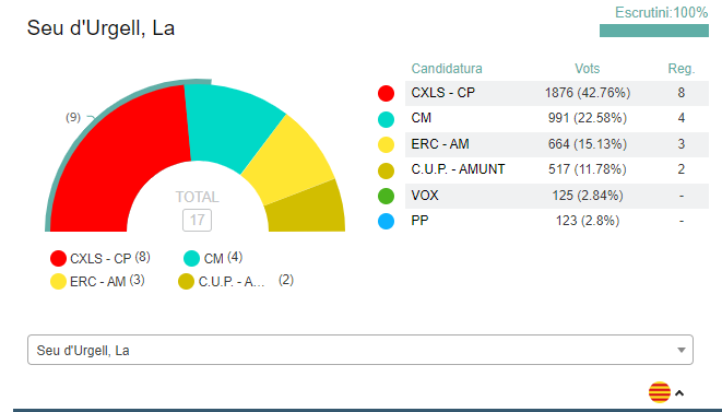 Compromís per la Seu d'Urgell ha guanyat les eleccions municipals amb el 100% del vot escrutat. La formació ha aconseguit 8 regidors, a un de la majoria absoluta, però la retirada de Junts d'un possible pacte independentista permetrà que Joan Barrera pugui governar.