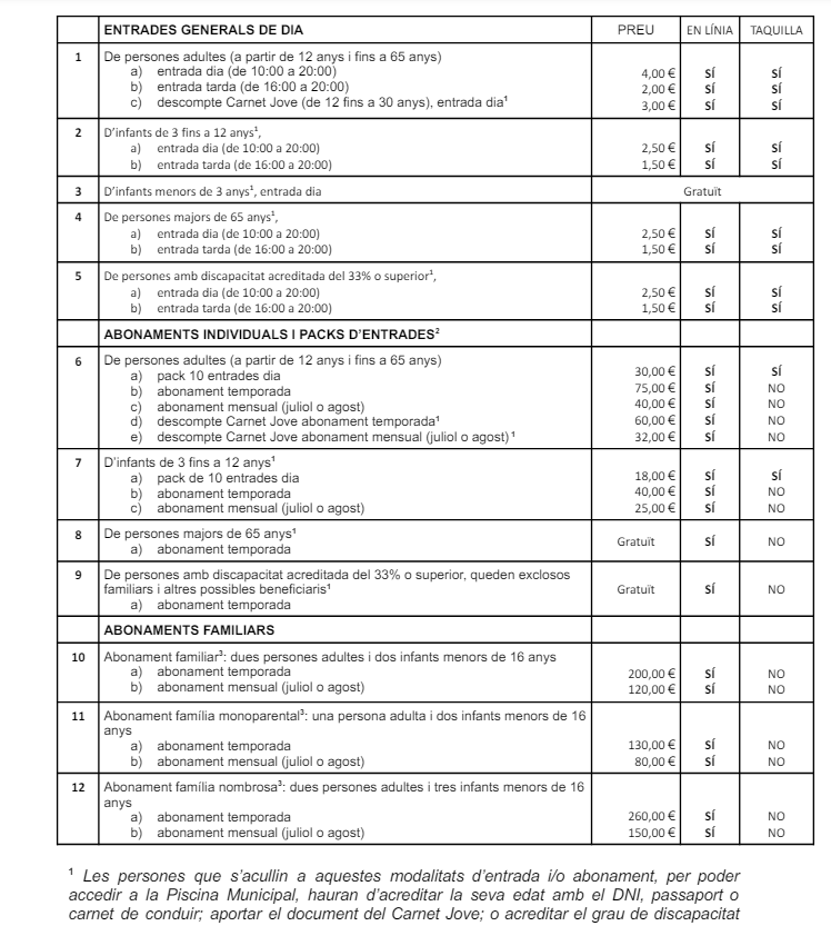 ¹ Les persones que s’acullin a aquestes modalitats d’entrada i/o abonament, per poder accedir a la Piscina Municipal, hauran d’acreditar la seva edat amb el DNI, passaport o carnet de conduir; aportar el document del Carnet Jove; o acreditar el grau de discapacitat amb la targeta acreditativa de la discapacitat de la Generalitat de Catalunya o amb document anàleg on aparegui el grau de discapacitat.