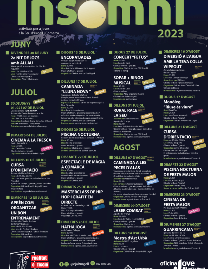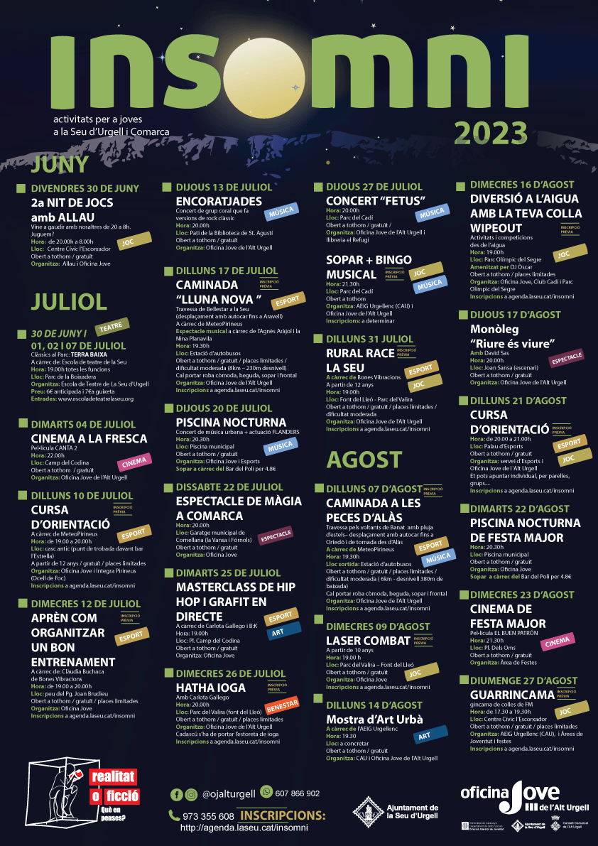 L’Insomni d’Estiu 2023, programa d’oci alternatiu per a joves a la Seu d’Urgell i comarca, proposa un total de 23 propostes de diferent índole que tindran lloc del 30 de juny al 27 d’agost amb teatre, música, esport, jocs, cinema, benestar, art, espectacles, entre d’altres activitats per gaudir de les vacances estivals. La regidora de Joventut de l’Ajuntament de la Seu, Christina Moreno, remarca que “aquest estiu, més Insomni que mai perquè els i les joves gaudeixin d’una gran varietat de propostes”.