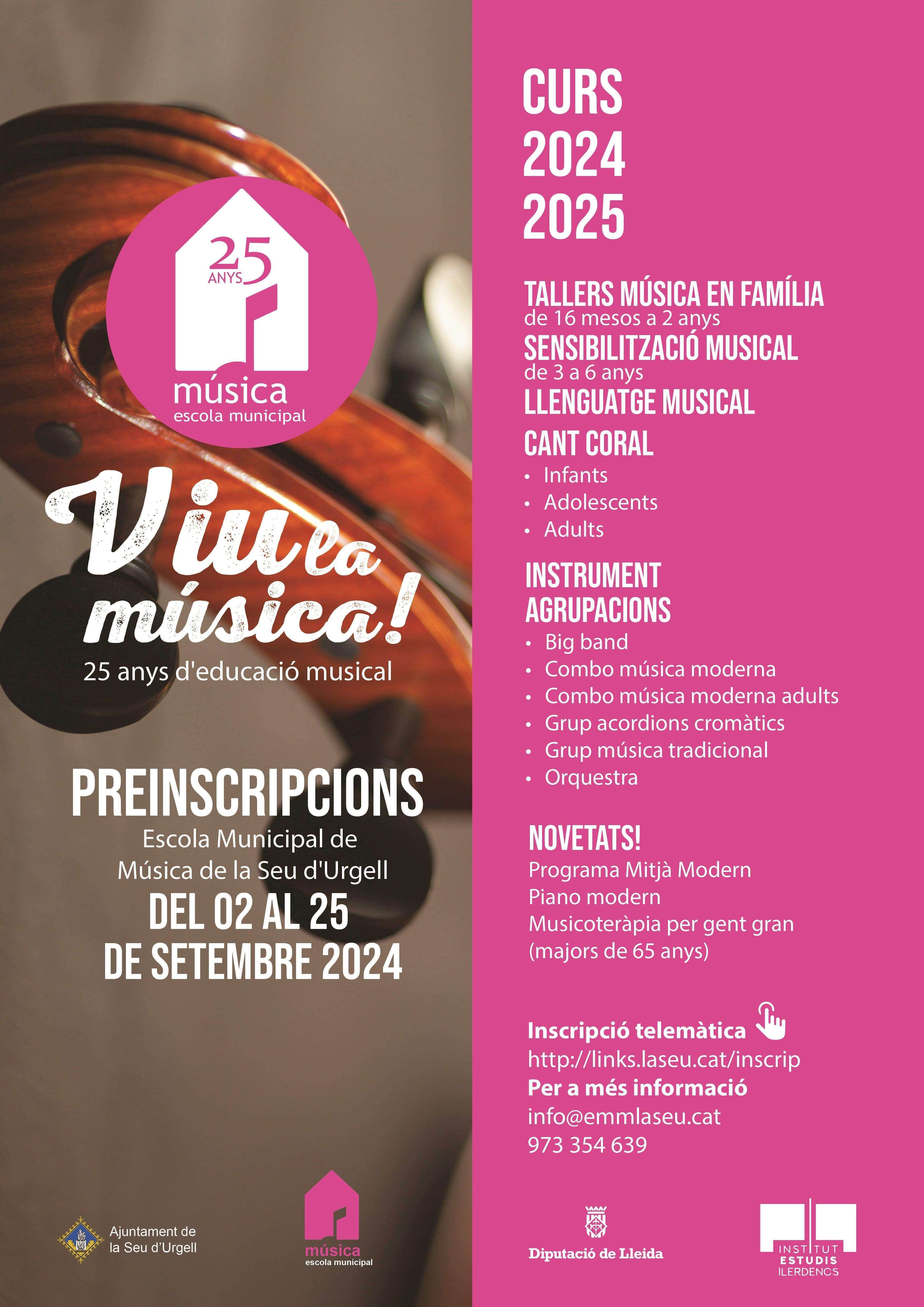 Avui dilluns 2 de setembre s’obren les preinscripcions per al curs 2024-2025 de l’Escola Municipal de Música de la Seu d’Urgell. El termini finalitzarà el pròxim 25 de setembre.