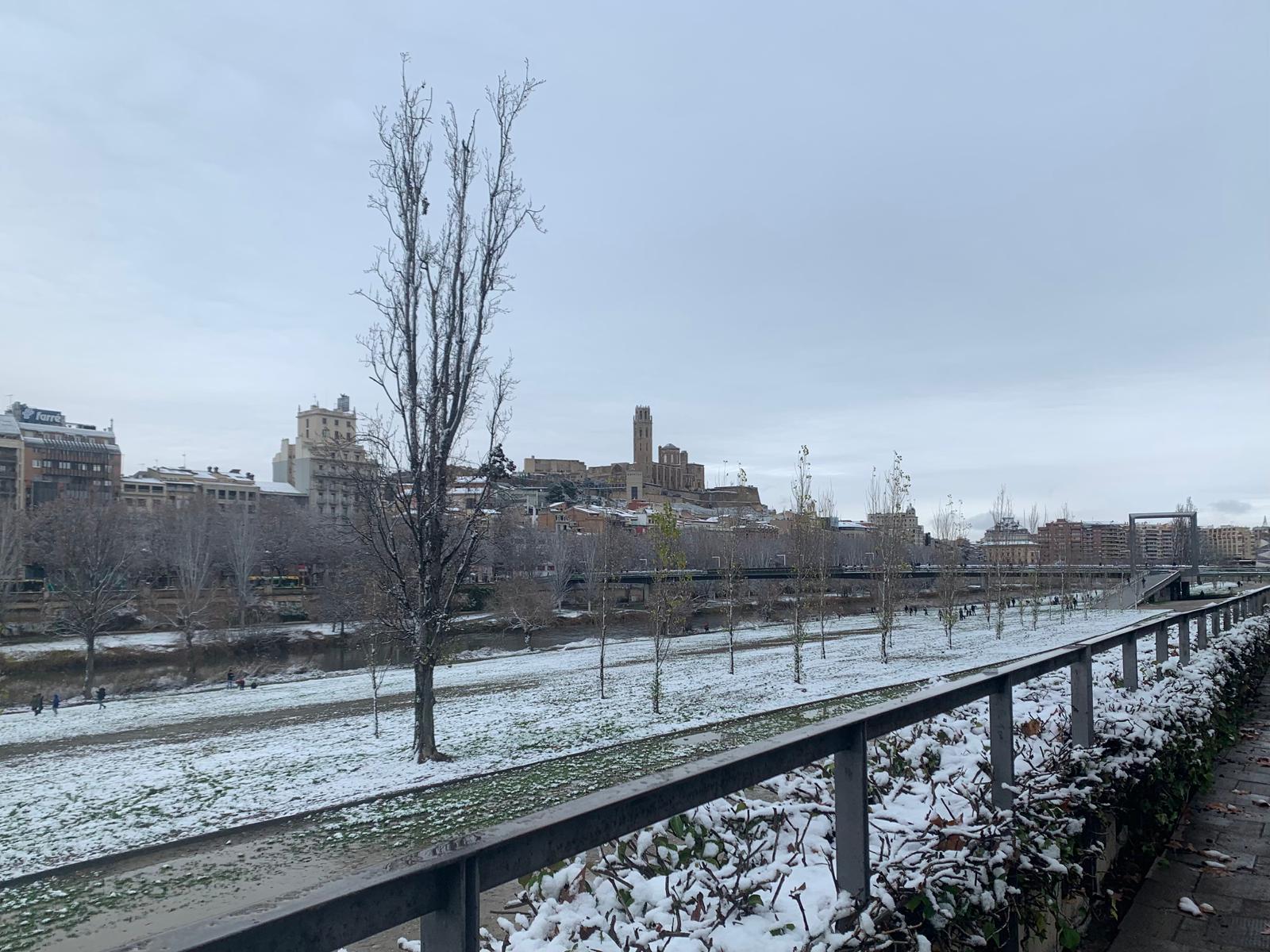 Fred i gel marquen l’inici de la setmana a la capital del Segrià, amb carrers, parcs i teulades emblanquinats, primeres acumulacions de fins a 2 cm i afectacions a trams de carretera amb cadenes obligatòries