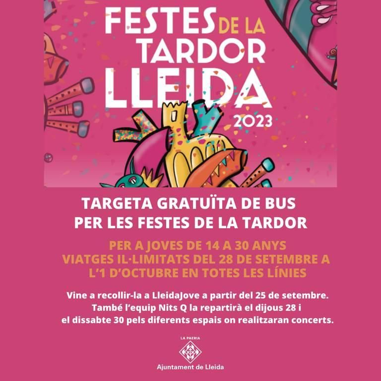 L’Ajuntament de Lleida posa a disposició dels joves de 14 a 30 anys una targeta de bus gratuïta amb viatges il·limitats des del 28 de setembre fins a l'1 d’octubre, durant les festes de la Tardor, amb totes les línies de bus de la ciutat i també en el servei de bus nocturn.