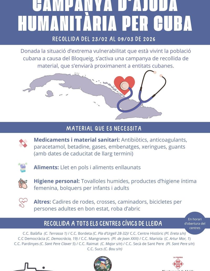 La Regidoria de Cooperació, en col·laboració amb el Casal d’Amistat amb Cuba de Lleida, ha posat en marxa una campanya solidària de recollida de material per donar suport a la població cubana, afectada per una situació d’extrema vulnerabilitat a causa del bloqueig imposat pels Estats Units.